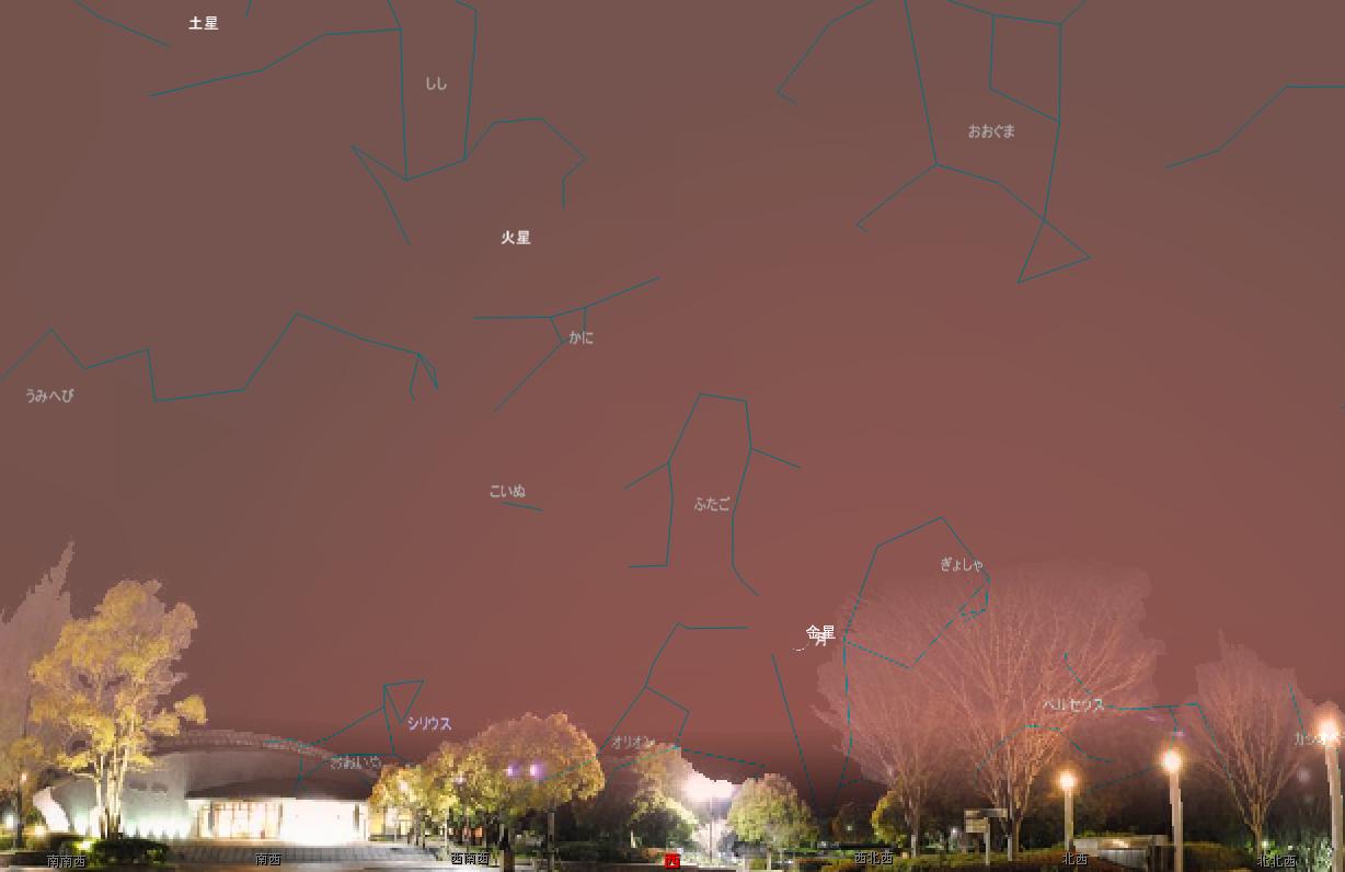 当日19時30分(ウォッチング開始時刻)のアクアドーム前広場から見た西の空の様子を、ステラナビゲータで再現してみました。