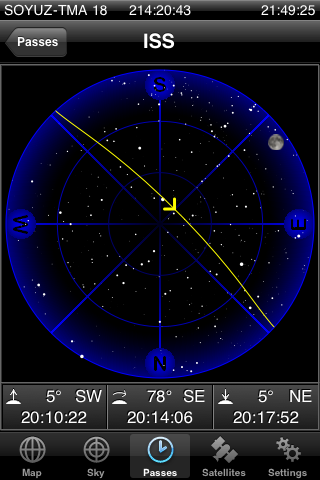 加藤さんからのメーリングリストに、次回6月26日のほしぞらウォッチングの時間帯にISS(国際宇宙ステーション)が見えるとありましたので、iPod touch/iPhoneのアプリ「GoSatWatch」で再現してみました。